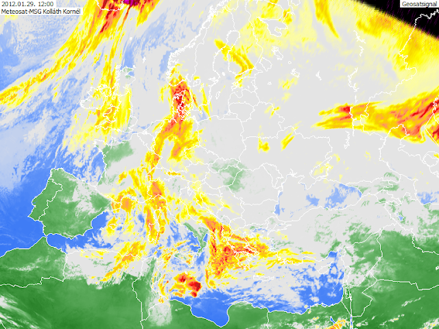 Ugyanez a gomba az MSG WV6.2-n. 12 UTC-kor a deformációs zóna (gomba fejének íve) a Balti tagállamoktól ível lefelé a Krim félszigetig, aminek közelében örvénylik Áron.